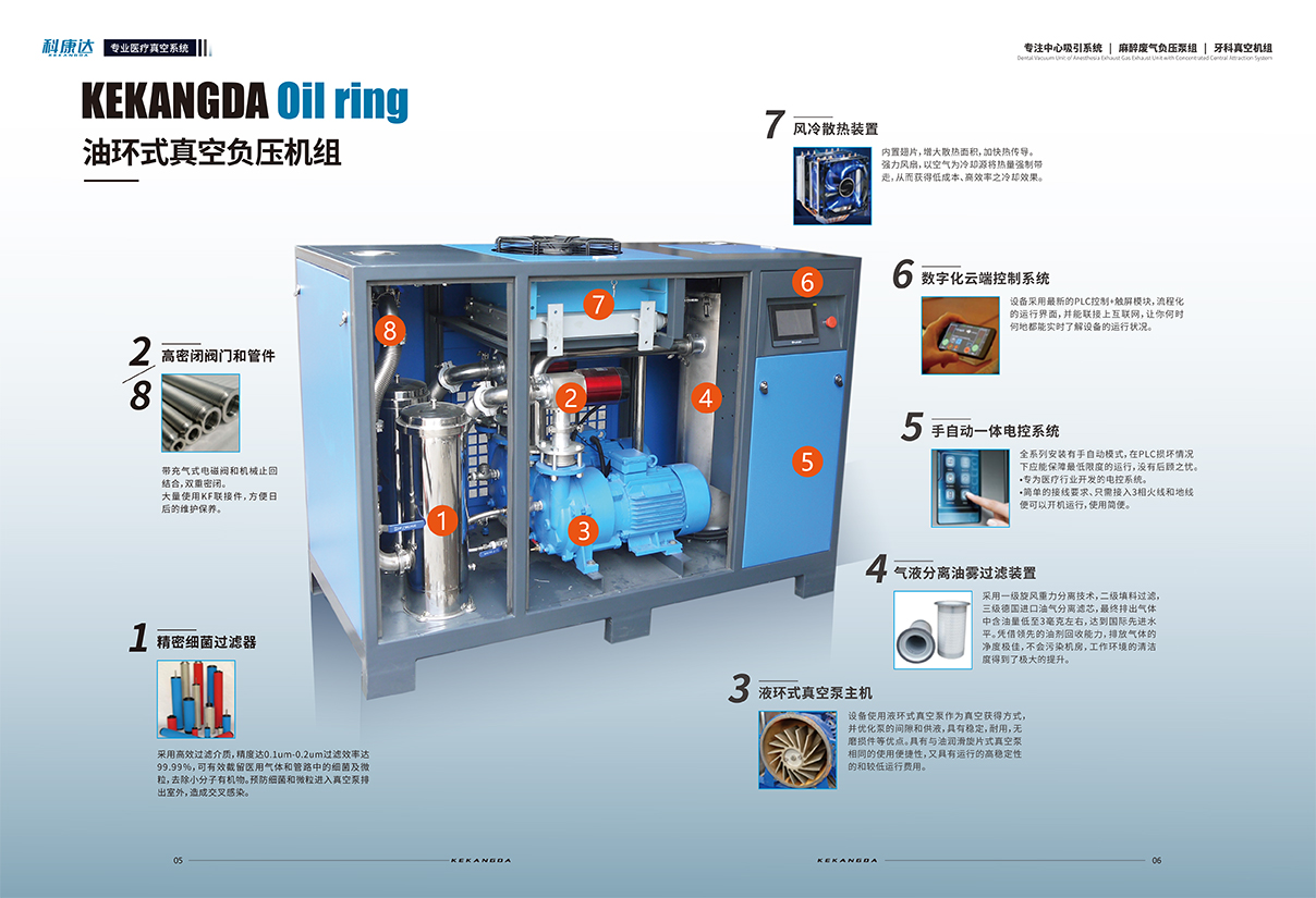 本机组是集本公司15年经验之大成。由2BV液环式真空泵,油水分离器,散热器,油雾过滤器,净化装置,电控系统、物联网技术,细菌过滤器、真空传感器、带充气式电磁阀、止回阀、各式阀门和管道等部件,集合成箱式一体机组,先进的控制技术和创新式的应用,极大提升了使用的便捷性和稳定性。